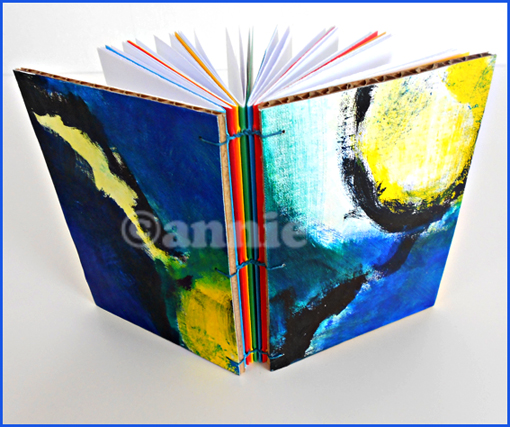 Ook hier weer restverwerking: de kaften zijn gemaakt van karton van een doos waar ik canvas op heb geplakt.